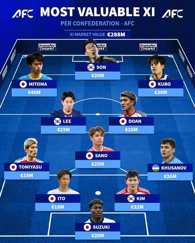 北京時間10月16日,德轉列出了目前亞洲球員中身價最高的11人陣容,身價4000萬歐元的三笘薰領銜,身價3500萬歐元的胡桑諾夫、身價3200萬歐元的金玟哉以及身價3000萬歐元的久保建英在列,此外孫興慜、李剛仁以及伊藤洋輝也都榜上有名。