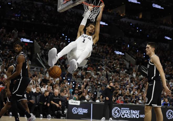 回顧本場比賽,籃網(wǎng)在一開始打出9比2的小高潮,反客為主,不過,馬刺很快就連得8分反超比分,此后又轟出一波9比0的攻擊波,穩(wěn)定住領(lǐng)先局面。在文班亞馬的帶領(lǐng)下,馬刺多點(diǎn)開花,一度讓分差突破20分,半場比賽結(jié)束,馬刺以69比48領(lǐng)先。易邊再戰(zhàn),馬刺打出一波7比0將分差拉大到了全場最大的26分,不過,他們此后在將近8分鐘的時間里沒有運(yùn)動戰(zhàn)得分,讓籃網(wǎng)迫近比分。末節(jié)決戰(zhàn),籃網(wǎng)轟出一波16比4的小高潮一度反超比分,不過馬刺依靠文班亞馬和瓦塞爾的關(guān)鍵得分,最終還是守住了新賽季的第一個主場。