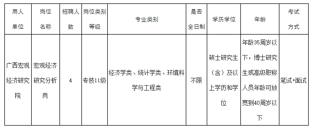 本次公開招聘實(shí)名編制工作人員4名,要求普通高等學(xué)校畢業(yè),經(jīng)濟(jì)學(xué)類、統(tǒng)計(jì)學(xué)類和環(huán)境科學(xué)與工程類專業(yè),具有碩士研究生(含)及以上學(xué)歷和學(xué)位,年齡35周歲以下(年齡截止報(bào)名首日),博士研究生或高級(jí)職稱人員年齡可放寬到40周歲以下(年齡截止報(bào)名首日)。