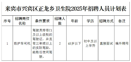 2025年廣西來賓市興賓區(qū)正龍鄉(xiāng)衛(wèi)生院公開招聘編外人員2人