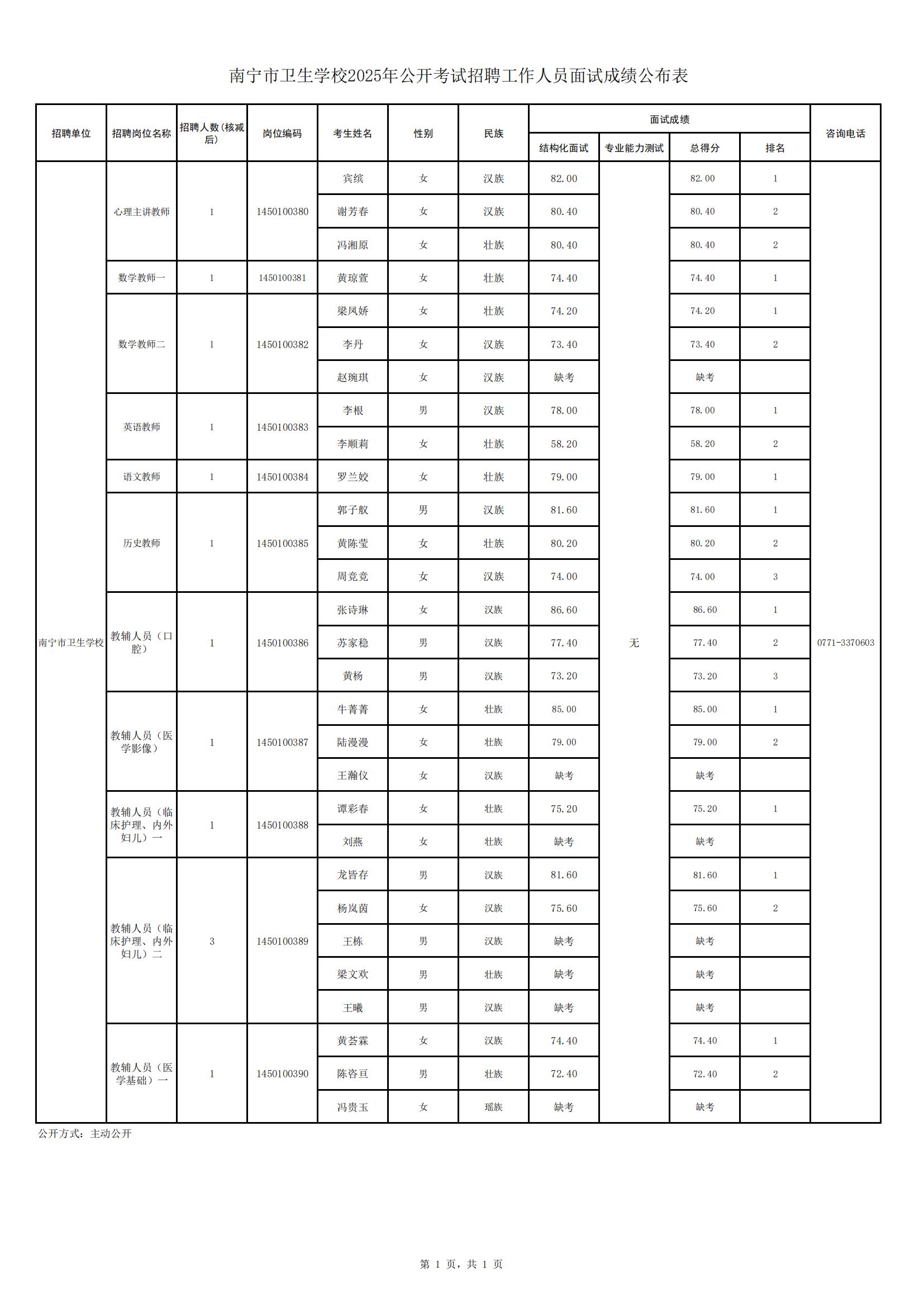 南寧市衛(wèi)生學校2025年公開考試招聘工作人員面試成績公布表
