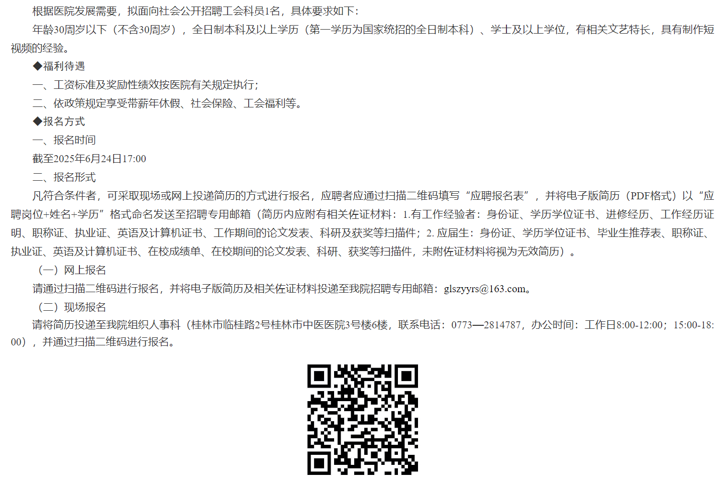 2025年桂林市中醫(yī)醫(yī)院工會科員招聘1人