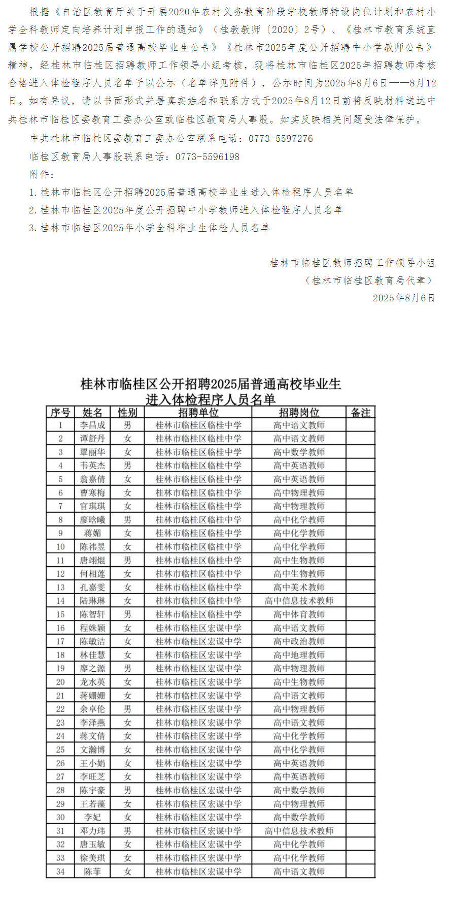 桂林市臨桂區(qū)2025年招聘教師考核合格進入體檢程序人員名單公示