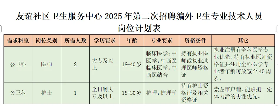 附件1 友誼社區(qū)衛(wèi)生服務(wù)中心2025年第二次招聘編外衛(wèi)生專業(yè)技術(shù)人員崗位計劃表.docx
