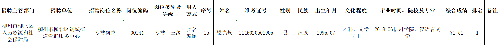 根據(jù)《柳州市2025年度下半年事業(yè)單位公開考試招聘工作人員公告》要求及安排,梁光煥同志經(jīng)面試、考察、體檢合格,符合聘用條件。經(jīng)研究決定,擬聘用梁光煥同志為我區(qū)事業(yè)單位工作人員,現(xiàn)予以公示,公示期為5個(gè)工作日(2026年1月22日至2026年1月28日)。對(duì)擬聘用的同志如有異議,請(qǐng)以書面形式,并署真實(shí)姓名和聯(lián)系地址,于2026年1月28日前郵寄或直接送我單位(地址:柳州市勝利路12-8號(hào)柳北區(qū)政府4樓417室;郵編:545002,電話0772-2513360),群眾如實(shí)反映有關(guān)問(wèn)題受法律保護(hù)。