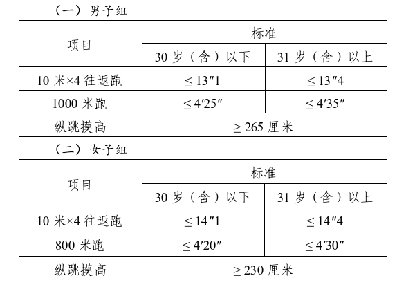 體能測(cè)評(píng)三項(xiàng)全部達(dá)標(biāo)方為合格。其中:縱跳摸高的測(cè)試次數(shù)不超過3次,10米×4往返跑的測(cè)試次數(shù)不超過2次,1000米跑/800米跑的測(cè)評(píng)次數(shù)為1次。