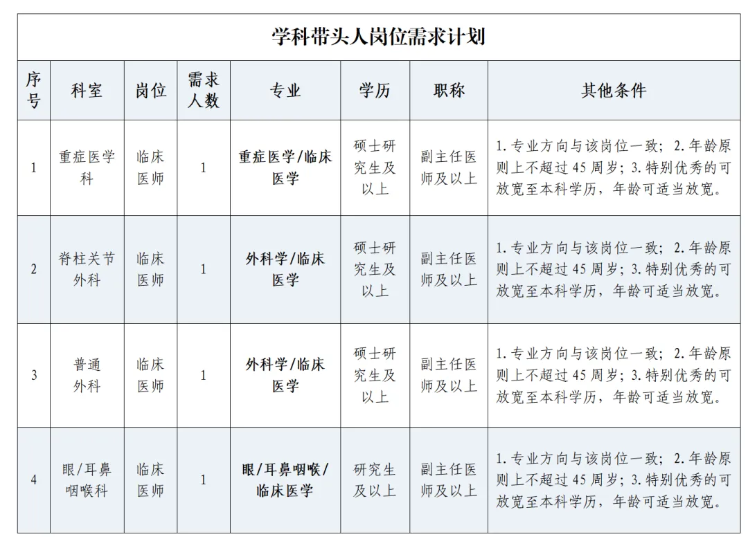 (四)原則上年齡不超過35歲,學(xué)科帶頭人、碩士學(xué)位不超過45歲,特別優(yōu)秀的可適放寬;